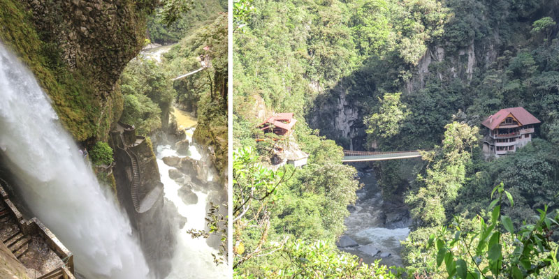 Das kleine nette Städtchen Baños liegt am Fuße des aktiven Vulkans Tungurahua und ist bekannt für seine Thermalquellen und Wasserfälle. Der beeindruckenste Wasserfall ist der „Pailón del Diablo“ (die Schlucht des Teufels). Die Wassermassen stürzen durch eine enge Schlucht und über einige Treppen kommst du direkt an den Wasserfall heran. Über eine Hängebrücke blickst du auf den Wasserfall und das Tal.
