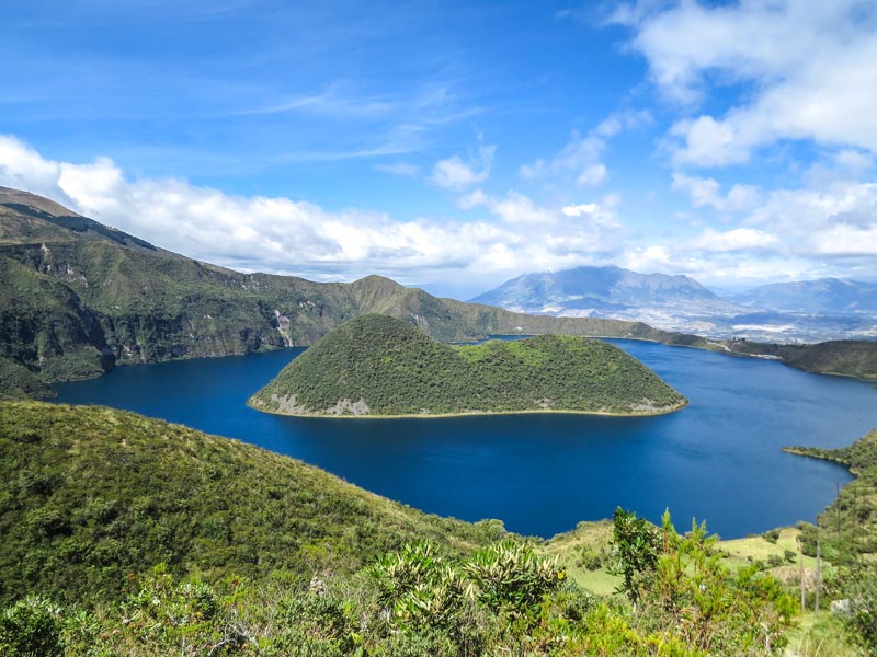 Der Cuicocha See (Meerschweinchen See) ist ebenfalls ein Kratersee und liegt auf 3480 m. Der See ist komplett anders als der Quilotoa. Das Wasser hat ein dunkles Blau wie das Meer und in der Mitte des Sees befinden sich noch kleine Vulkankegel die als Inseln aus dem See ragen.
