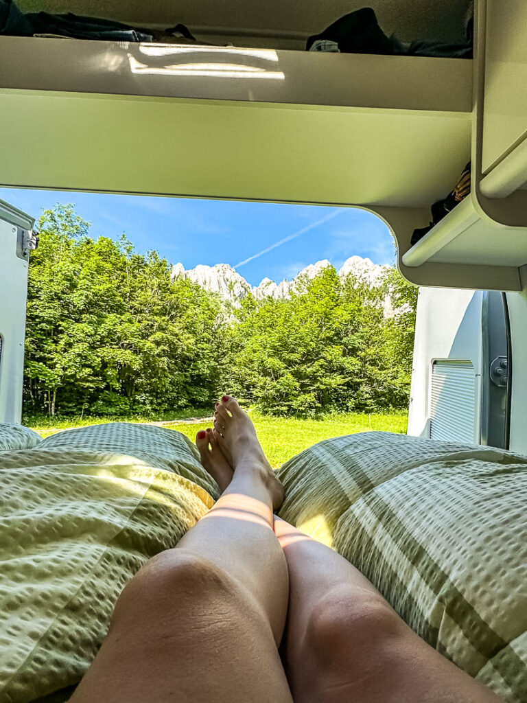 Allerdings ist der Campervan ein echtes Raumwunder – nicht nur, dass sich unser ganzer Kram inklusive Technikequipment (Drohne, Kamera, Laptop, Steckerleisten) wunderbar verstauen ließ. Sogar an große Menschen wurde gedacht: Da das Reisemobil nur angenehme 2,05 Meter breit ist, hat Etrusco das sogenannte „xFlip“ entwickelt. Das ist im Prinzip ein ausklappbares Fenster für deine Füße. So können auch große Personen ohne Probleme in dem Bett schlafen.