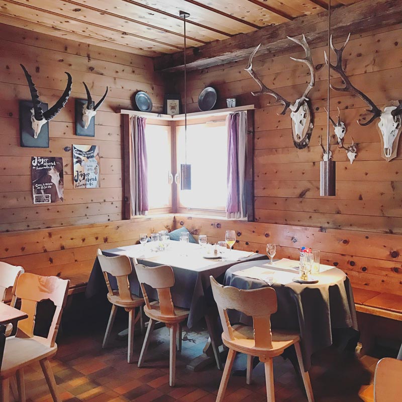 Was wäre ein Schweiz Besuch ohne ein anständiges Käsefondue? Daher spazieren wir am Abend hinauf zur Mittelstation in die Tegia Larnags, eine urige Bergstube mit leckeren Schweizer Spezialitäten. Logischerweise bestellen wir ein Käsefondue, allerdings der besonders leckeren Art, nämlich mit Obst.
