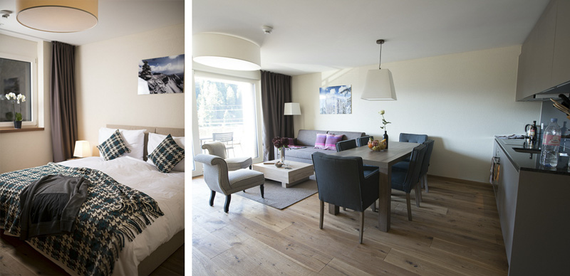 Nach einer entspannten Anreise checken wir im Hotel Peaks Place direkt gegenüber der Talstation ein. Das Hotel ist von außen eher unscheinbar, von innen aber stilvoll und modern gemütlich eingerichtet. Unser Appartement hat schöne Holzbohlen, einen großen Wohn-/Essbereich mit Küche und ein großzügiges Schlafzimmer. Herrlich, was will man mehr!