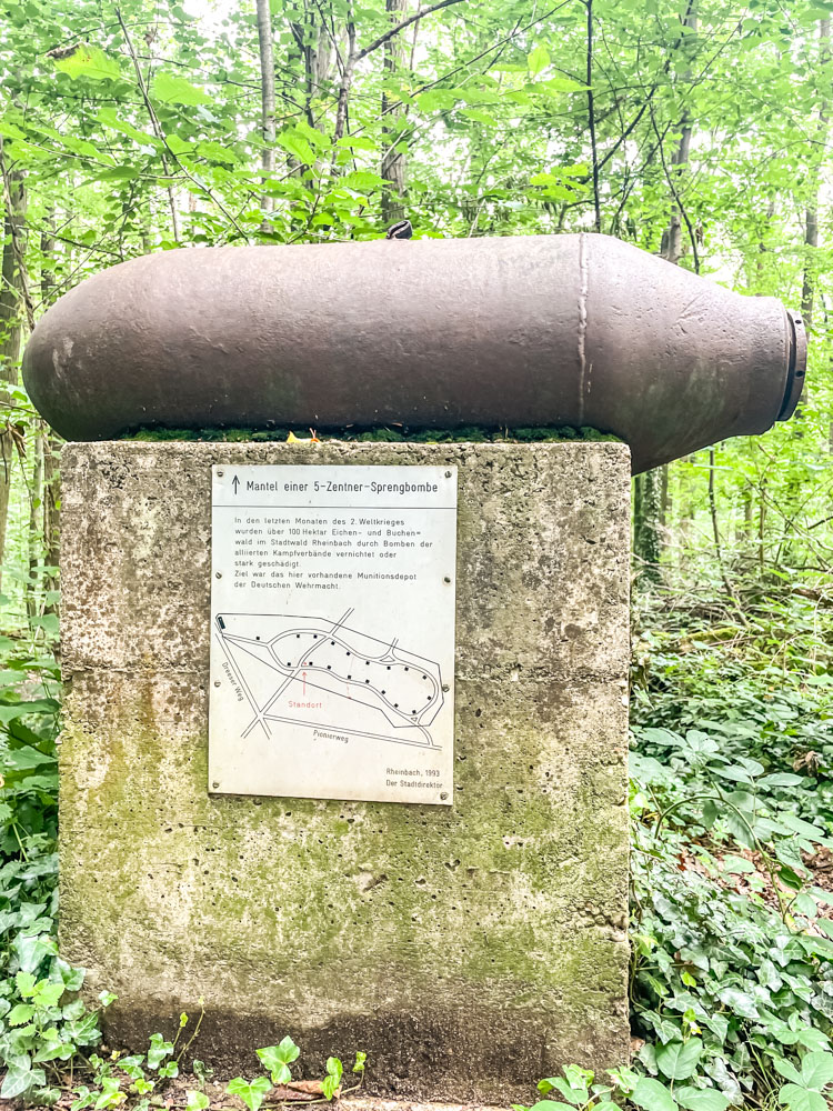 Wir starten in Rheinbach am Bahnhof und nehmen dieses Mal Kurs Richtung Schwimmbad Monte Mare. Hier geht es stetig bergauf in den Wald. Wir fahren vorbei an den alten Kriegsrelikten und einer ausgestellten Fliegerbombe. Dann verschwinden wir auf einem schönen Trail der uns bergab in eine Senke führt. Der Wald hier ist wunderschön und die Baumwurzeln schütteln uns ordentlich durch.