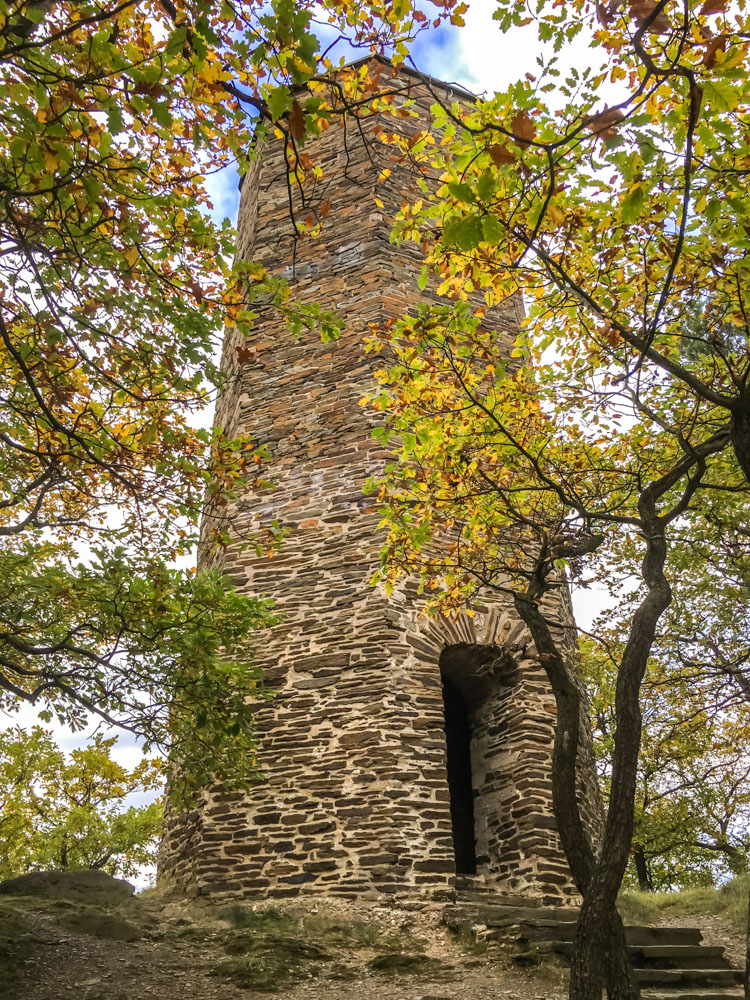 Das Weinbergmassiv umrundet, tut sich der Blick auf die Klosterruine Marienthal auf. Es geht abwärts an der Ruine vorbei, so dass wir eine Einkehr ermöglicht bekommen. Noch keine Lust? Kein Thema, wir kommen noch an weiteren Lokalitäten vorbei! Weiter bergan fahren wir auf den Trotzenberg und biegen unterhalb des Regierungsbunkers auf die zugehörige Hochebene. Dann geht es zur Bunten Kuh, dem nächsten Aussichtspunkt.